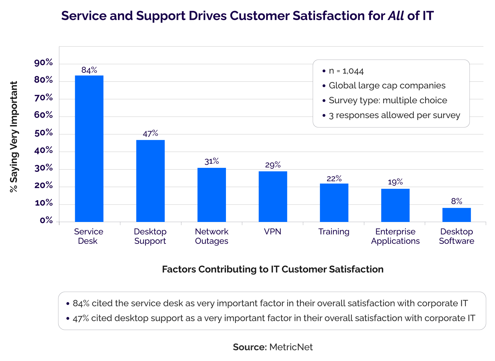 According to the chart below, published by MetricNet and based on their own data, 84% of respondents cited the service desk as the largest driver and a very important factor in their overall satisfaction with corporate IT (nearly twice the next closest factor).